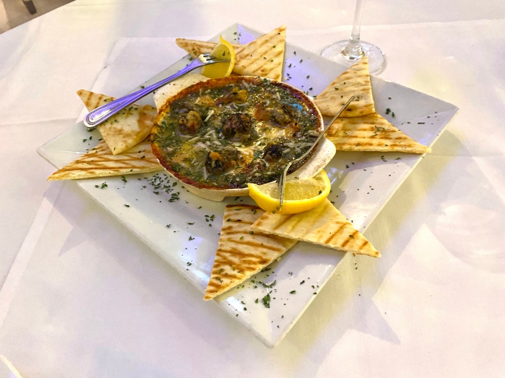 The pool, back in the day!We ate at the empty table in the front. Harry couldn’t hear what was being served and he just “dove” right in to the dish nearest him. I was eating the hummus on the other plate and Harry was eating from the dish in front of him. With a big grin he said, “ What is this that I am eating? It is really good.” I said…” ESCARGOT.” He said, Well, in Rome.” So I ate some, too. Not bad!Escargot is served!