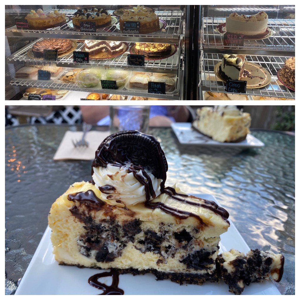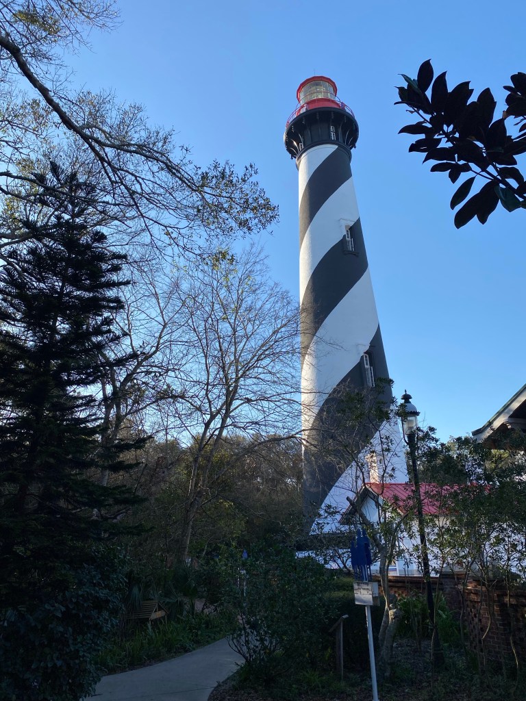 Saint Augustine is getting a new type of bar. We took a sneak peek as we walked to our next restaurant. It wasn’t opened, but Judy talked them into letting us take a look. Whatever you get to drink, you can pick whichever rubber Ducky you want to float in it. I think it’s a bit strange. I’d say that’s quirky!!The little bathtub bench could be cute in a dressing room. So what do you think? Will this be a winner new business or a loser? Charcuterie board at Bin 39. Just so so! Judy just had to take our picture kissing under the “Love Tree”. Folk lore has it , if you kiss under this tree…you will never grow apart. Note the live oak tree hosting a palm tree. Judy says she does not think man grafted these to together but instead is a natural phenomenon.Last but certainly not least, Oreo Cheesecake…we think it was Bar Harbor Cheesecake…I should have taken pictures of the front of these restaurants but this is our best guess.The light house in Saint Augustine.
