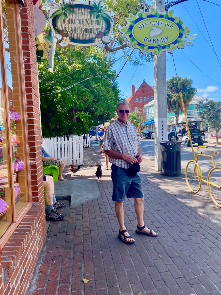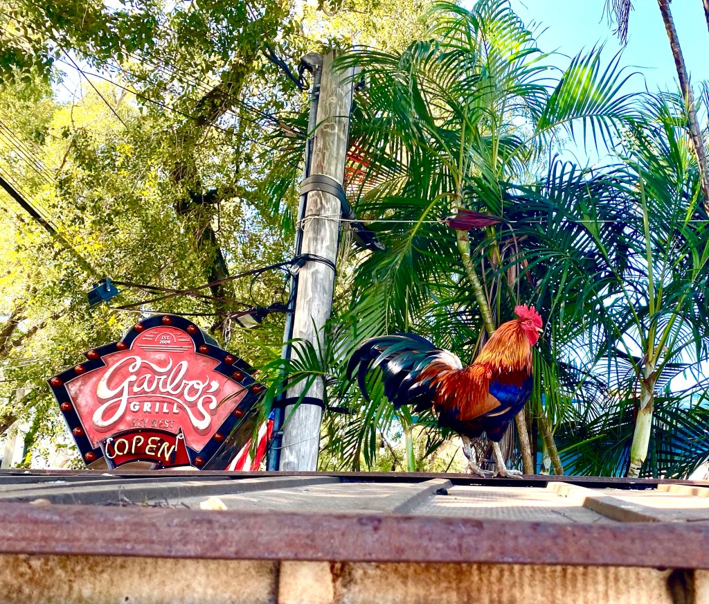 Garbo’s Grill…A fun place for lunch. No chicken on the menu. Harry had a fish burrito and I chose a shrimp/ mango taco. Pretty delicious!They say these hens and roosters are descendent of Cuban and Caribbean chickens. They brought them over to the states to use for food and cockfighting. It became illegal in 1986 to participate in gaming of this nature. And the story goes…they simply let all the birds free and ever since, they have been roaming around the streets begging for food and posing for pictures.We enjoyed exploring the city and boardwalk!s!Not a chicken!