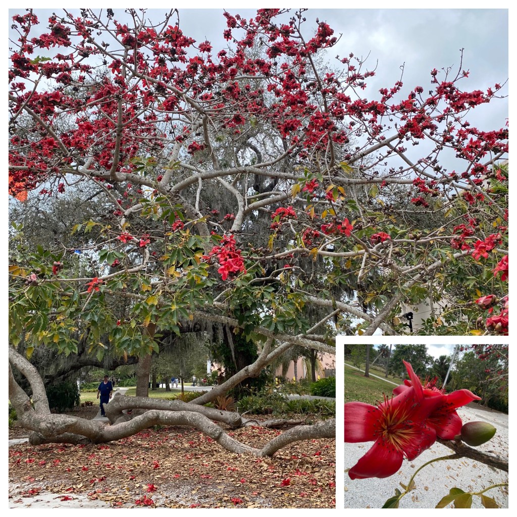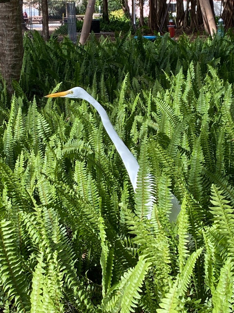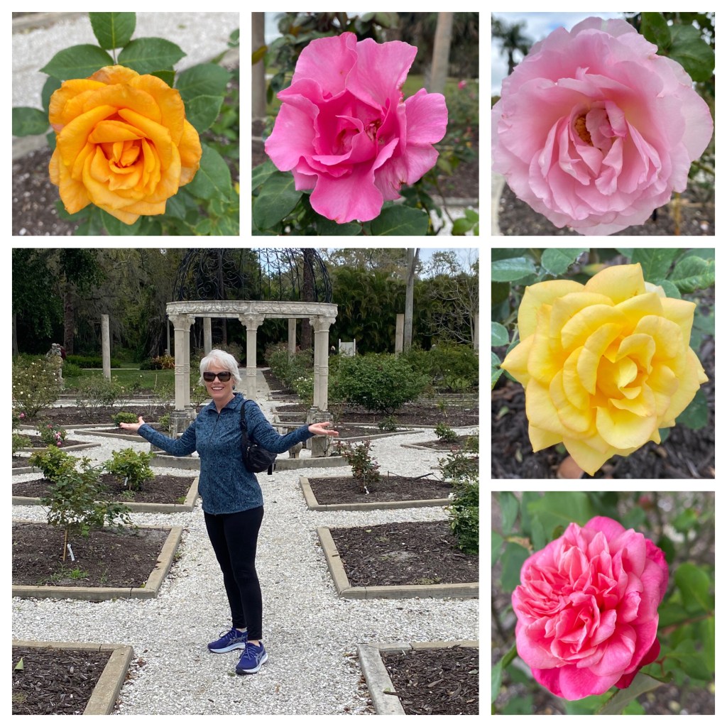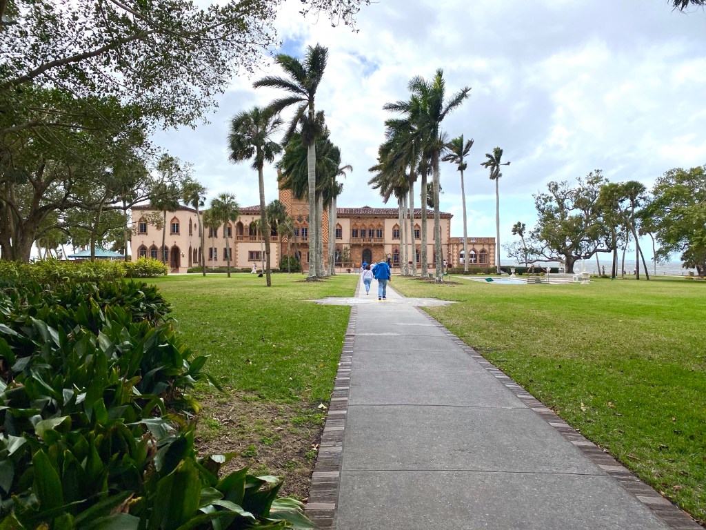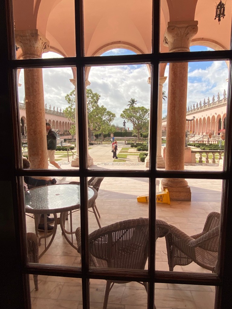 It may look like we are mere inches above the ground but it seemed like we were at least 15 feet in the air! Thankfully no Vagabonds were injured on this high wire trick.Probably, one of our very favorite rooms was this one with miniature circus tents, trains, acts, menagerie and anything else you can think of having to do with a circus! It is the genius of Howard C. Tibbals. He built his first train car as a young child, being inspired by his trips to the circus. His wife told her mom, who would have thought she would marry a man, who liked to play with dolls, as much as she did! Howard made everything himself,,,down to each folding chair that really folded.They are also the home of Florida’s oldest rose garden…. Mable Ringling’s collection.A fig tree in bloom. Several Asian girls were picking the fruit and eating it. They assured me it wasn’t ripe.“I’m a fern! I’m a fern! You don’t see me! I’m am not moving even though you are standing right beside me!”The Ringling’s home off the Sarasota Bay.Taken looking out onto the courtyard from within the John and Mable Ringling Art Museum!We also visited the Florida Art Museum. Lots to see there! Such a beautiful collection of art!The weather today was a tad cooler…like 20 degrees cooler and very breezy. We are farther north, after all!