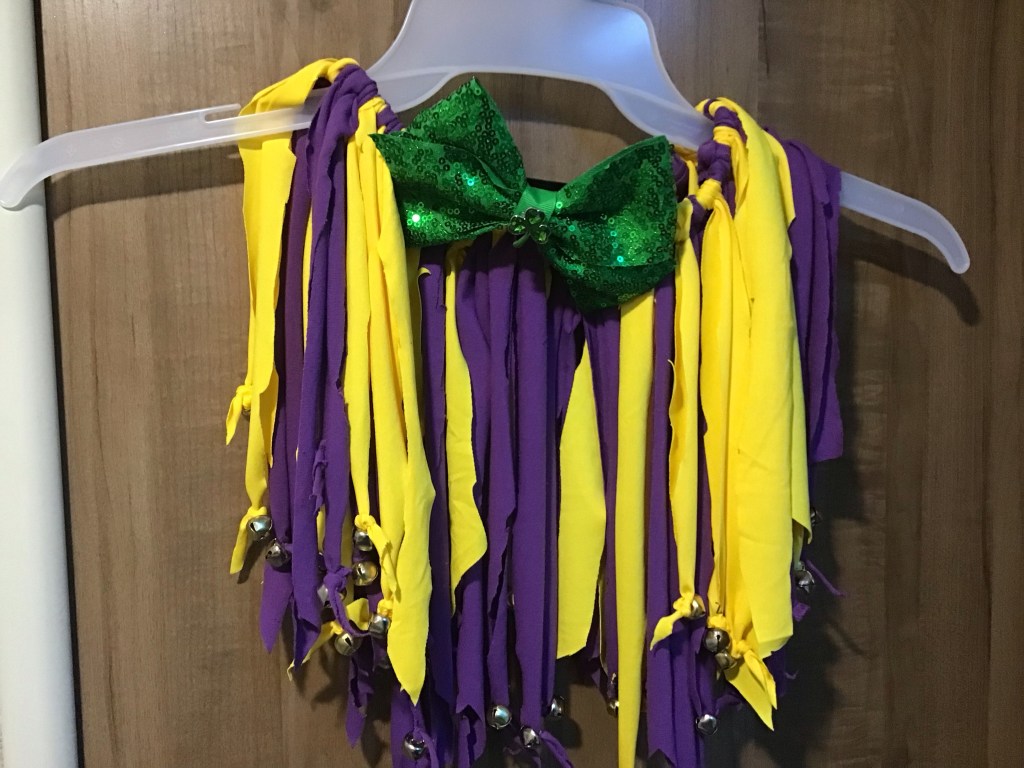 And who knew we were rolling into the campground the evening before the Mardi Paws Parade? What? We are to have Finn ready tomorrow morning dressed for a parade. The Vagabonds were clueless. We went to the local Walmart and they did not even have Mardi Gras party supplies. So we ripped up a few t-shirts, put bells on the ends and that will be his costume. It should be quite the show, that is if everyone is not deterred by the cold weather. I am sure most of the campers who have been here for a while will have had time to get something together or ordered in. But here is Finn’s Mardi Paws cape. This is probably the best it will look.