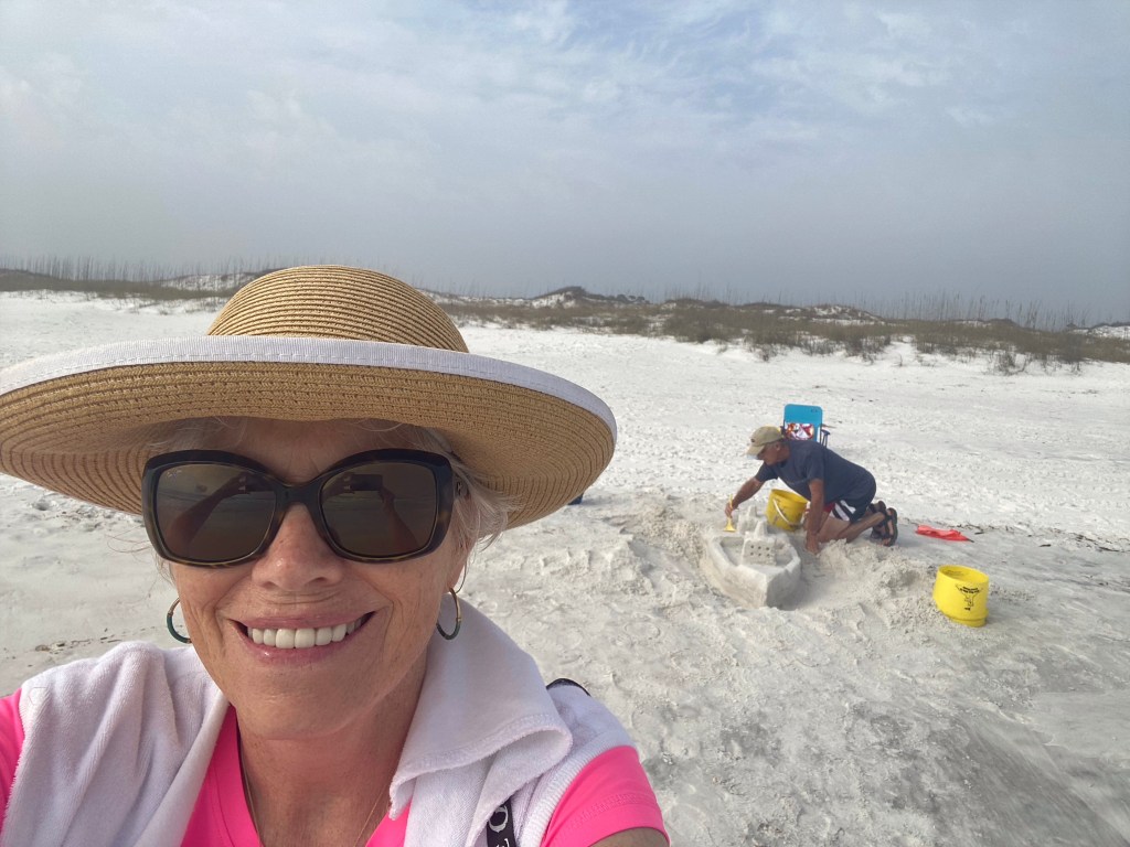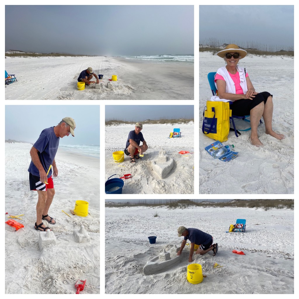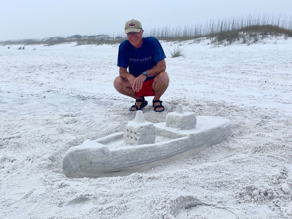 We spent three hours on the beach. While I walked the beach and sat in the peanut gallery…Harry used his hidden shipbuilding talents to produce his first ever ship sand structure.