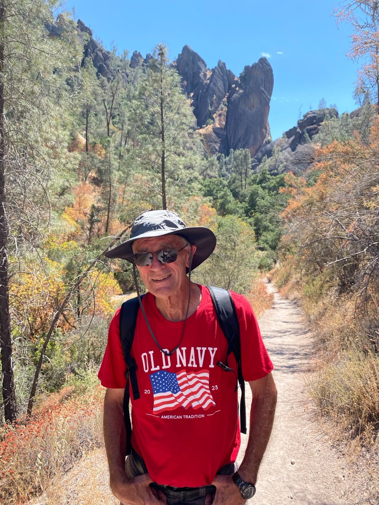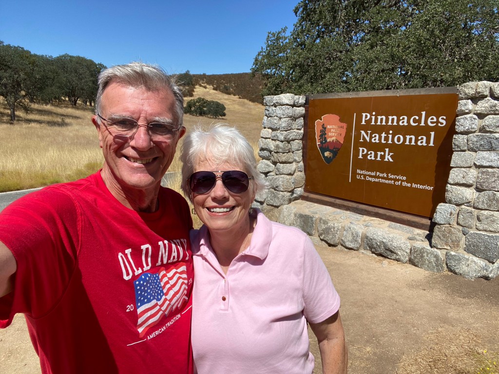 For our one day at the Pinnacles, a good hot hike was in order. We took the Balconies, Cliffs and Cave Loop. Leaving 78° weather in the city of Soledad we wound our way up to the Pinnacles’ headquarters where we realized the temperatures were rising. Got our US National Park’s Passports stamped with today’s date, purchased our park sticker and watched the park video. It was there we found out the California Condor had been reintroduced to the park in 2003 and is flourishing. We spotted several birds as you can see in the photo below but they were too high to discern whether they were Condors or turkey vultures.