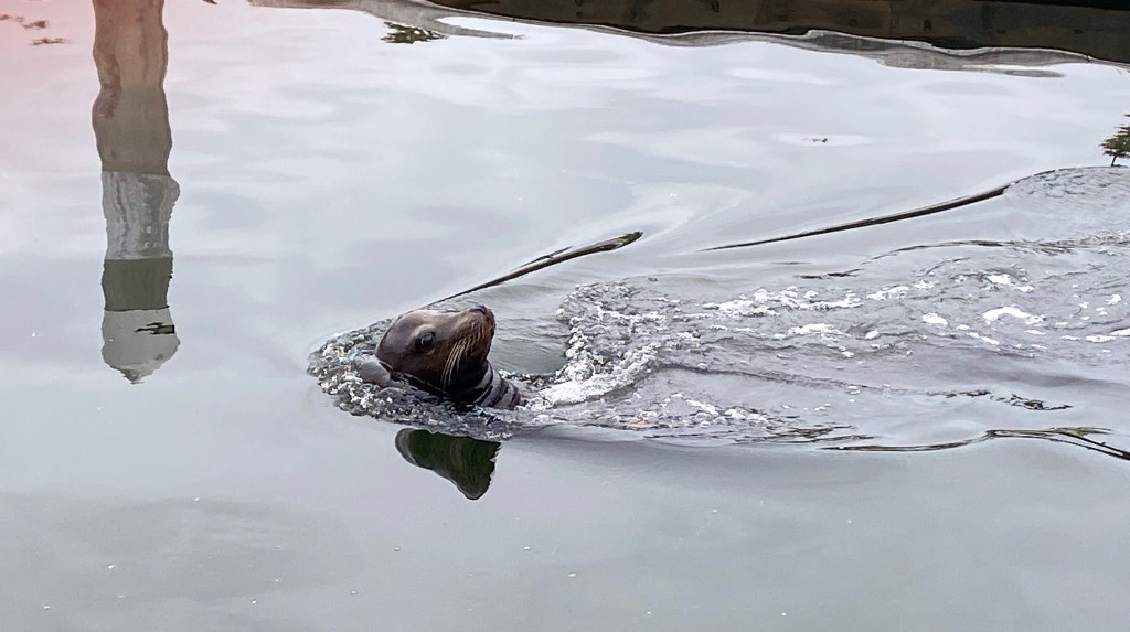 Just an FYI…Seals do bark all night long. Harry took his hearing aids out so last night was pretty quiet for him. I, on the other hand, heard every yip and bark. Here’s the scoop. These two piers are being renovated and when the workers left for the weekend, the seals moved in for a lazy weekend of play and relaxation. This morning the workers came bright and early and shooed them off with loud claps and whistles. Although the seals were not very chipper about the new rules…they jumped off and that is when I captured this picture of one on our morning walk.