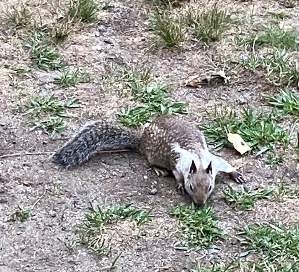 Ahwahnee Hotel. This is where we stayed. They call this the front yard but you do not enter this door unless you are coming from the cottages. They are in the middle of a refurbishment as you can see by the scaffolding. The circle indicates a place we sat on several occasions, trying to get a strong enough signal to upload our Blog. Needless to say…it did not ever happen! We also ate a Häagen Dazs, ice cream bar,/chocolate, coffee, and crunchy nuts. On one of these benches! Below you will see a Yosemite squirrel.