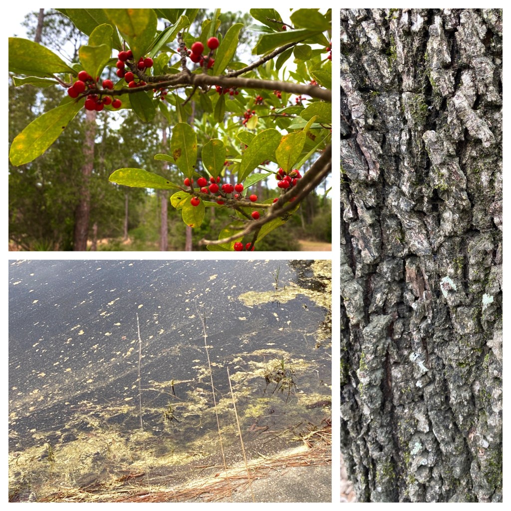 We had a bit of a hike but we didn’t want to go too far afield since the weatherman had given us 70% odds it would rain today. The berried tree is a mystery to me. I’m thinking holly family but you can see that the leaves don’t really scream that. Bottom picture shows that the pollen is floating atop the lakes, now.