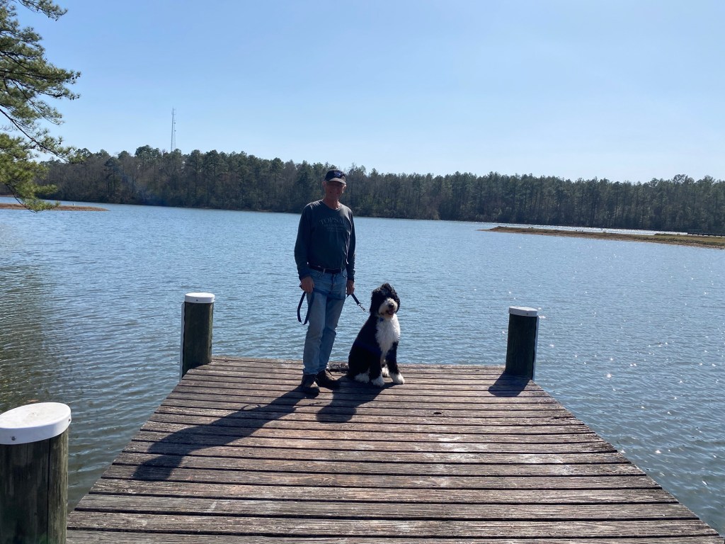 Sunny and windy today. We took a walk around the park and checked out some of their many fishing piers. Some were wooden and some were land piers stretching out into the lake.