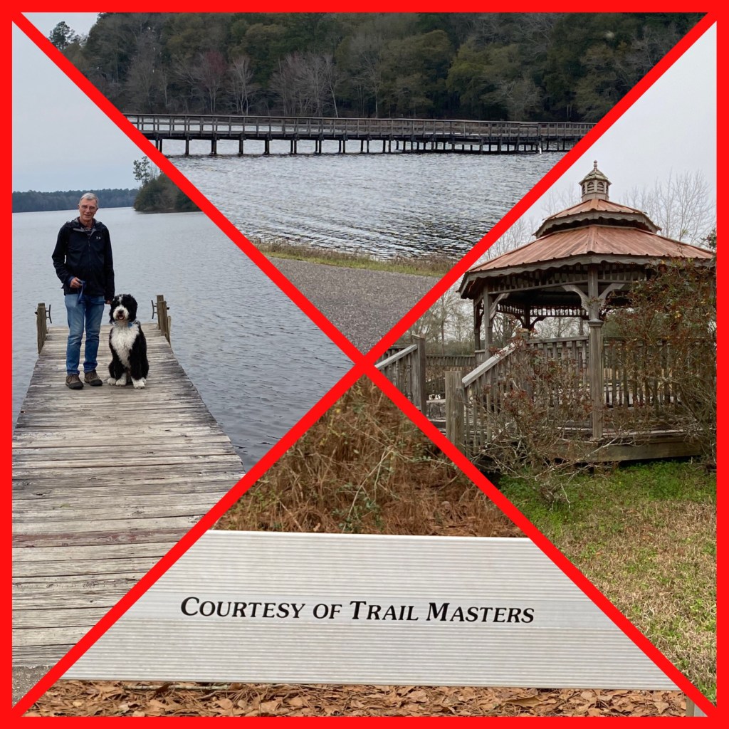 It was near this Gazebo, in a large field, that we put Finn on his Flexible Terrain leash. Tried my hand at the Alabama State flag with my outlining!