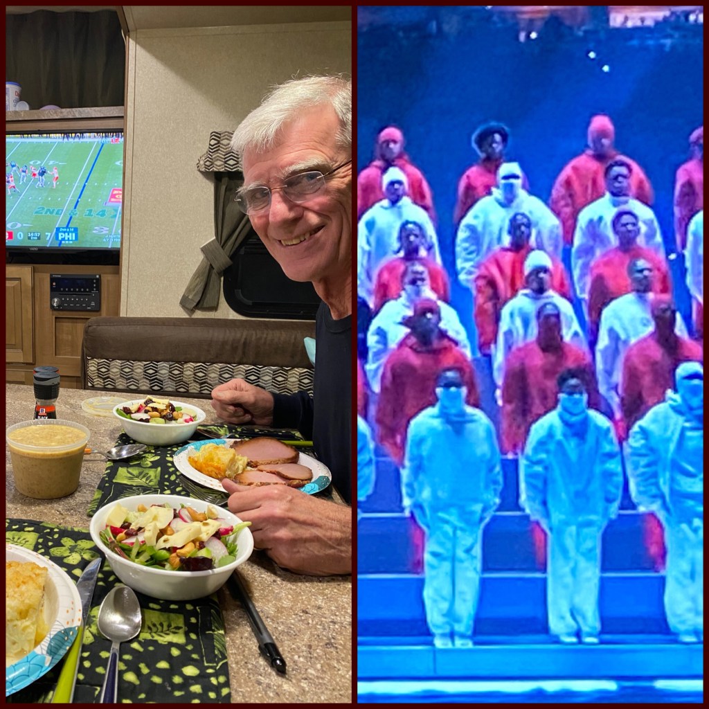 Harry and I worked on Valentines today! Hopefully they will be in the mail tomorrow! Those grands in college might watch their boxes this week. 😊❤️ Pictures of finished product to appear on Valentines Day!Since we had the campground to ourselves, we took advantage of the laundry facilities! Ready to roll tomorrow!Dinner and Super Bowl. Harry and I decided they don’t gear the halftime presentations to people of our age! Did you know an interesting fact? Nick Sirianni went to my Alma Mater, Mount Union University in Alliance, Ohio from 1999-2003 and started out as the Defensive Backs COACH 2004 for Mount Union! Pretty cool!😎