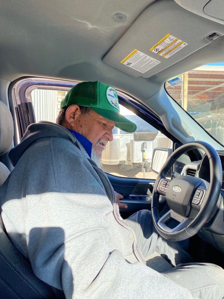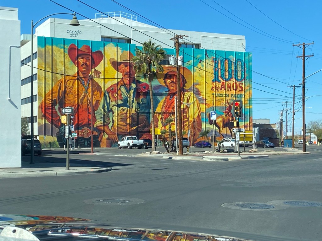 Any time he needed the driving done…he did it himself. He was not easy to understand when he spoke. I just thought he was more of a mumbler but Harry said he didn’t have any teeth. Who knows? Dropping the camper off for propane line repair and we were to find…we also needed a new brake line. David, the first guy yesterday, had really just tacked it up and Richard felt he needed to fix it properly. So we set off to explore Tucson but not too far afield because we wanted to be close-by when they called. ( I snuck this picture while Richard was figuring out the truck .)
