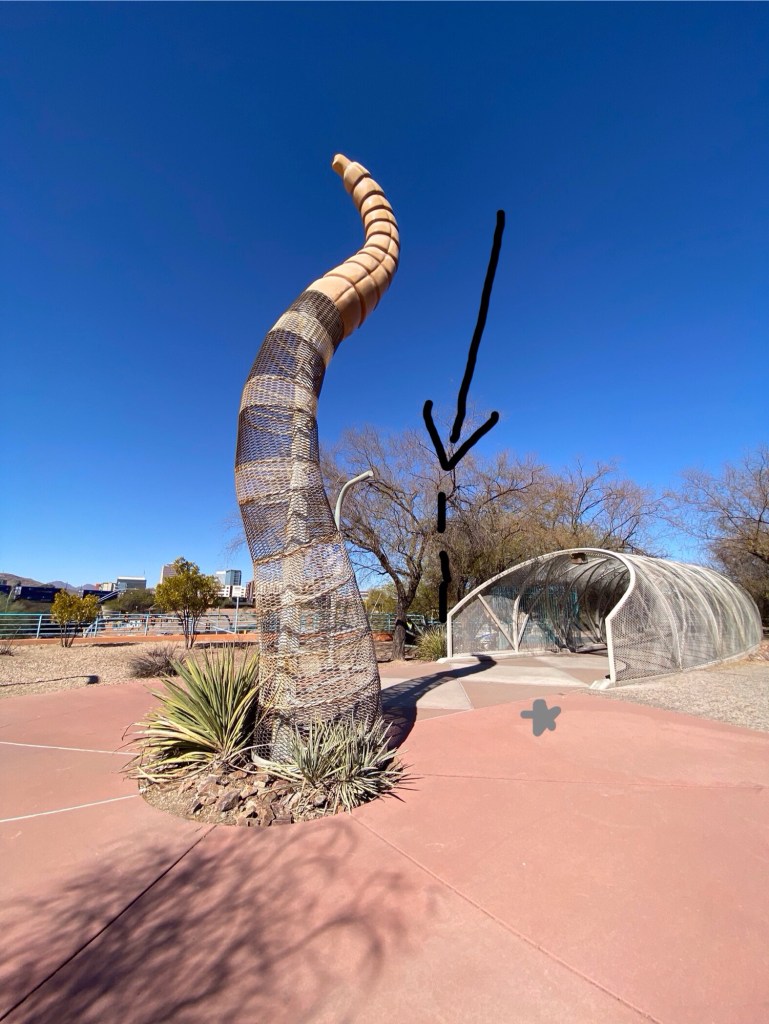 We walked across the bridge over the four-lane. We had such a beautiful day to explore…81 degrees. Below is what we found on the other side of the bridge. And…wait for it…they had a motion detector and you heard the rattling of the snake tail.