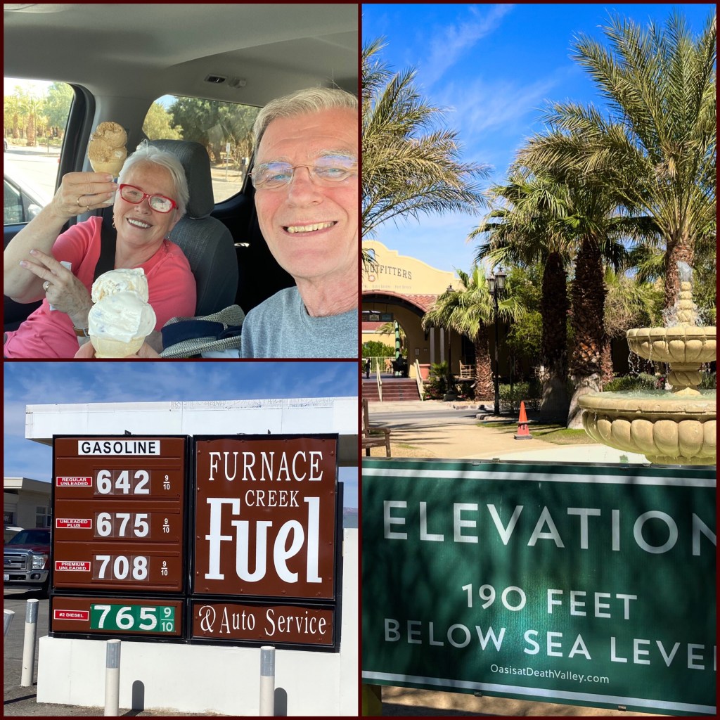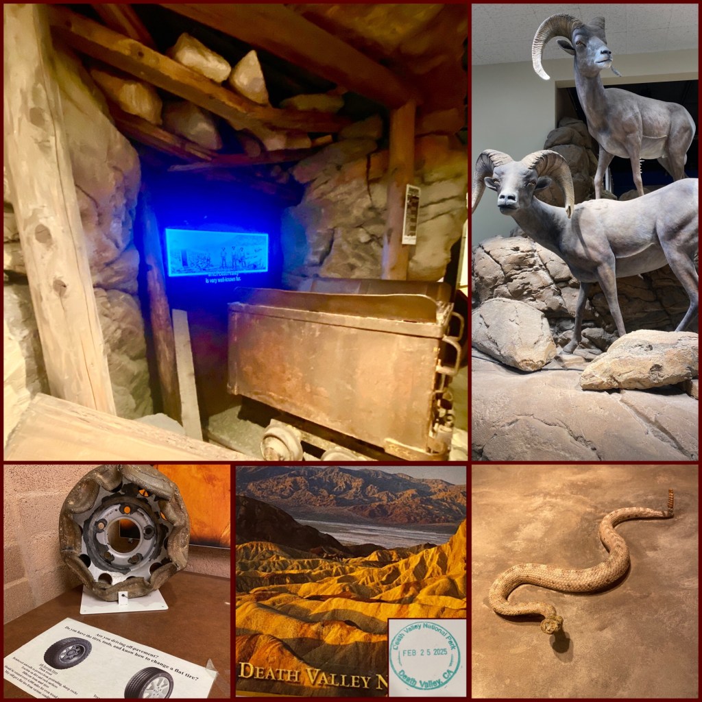 This morning we headed to Furnace Creek Visitor Center. Got our passports stamped and looked around. The tire above is one on a four wheeler that got stranded. The tire is melted onto the rim. It was 86 degrees today. Silver, gold, zinc, talc, tungsten and borax were mined in Death Valley. Animals are not real in this collage but statues.