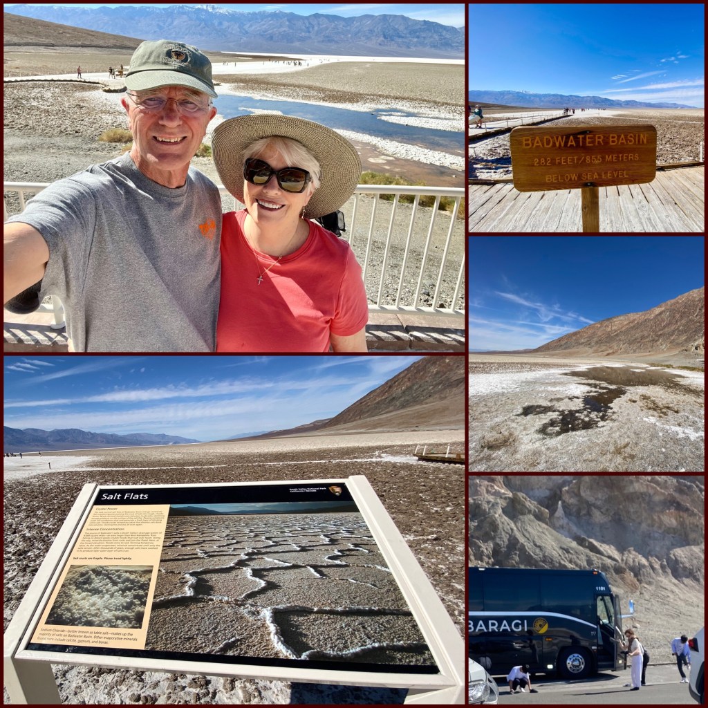 Second stop- Badwater Basin 282 feet below sea level along with the beautiful Salt-flats. We walked out onto them. Lower right picture shows a bus driver making his bus load of Asian visitors bang the salt out and off of their shoes before entering his bus.