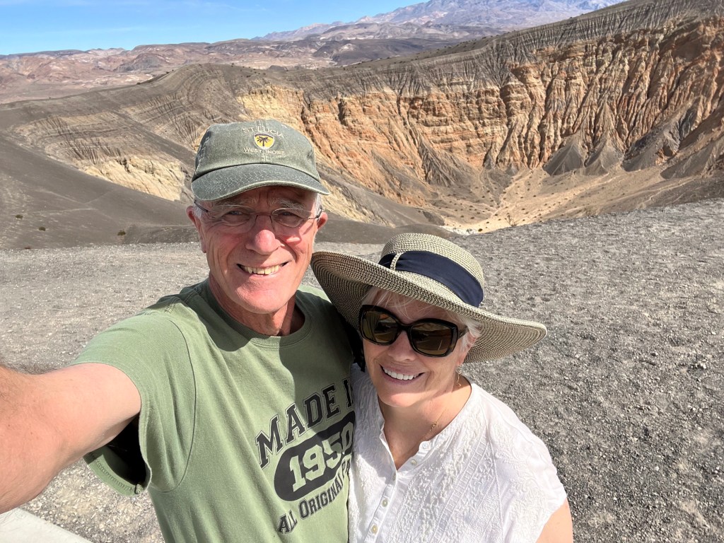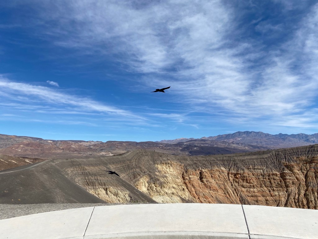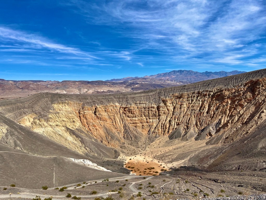 Drove forty miles across Death Valley to visit Ubehebe Crater ( u-bee-hee-bee) this morning and early afternoon. They figure it is pretty young by crater standards- 2,000 years old.