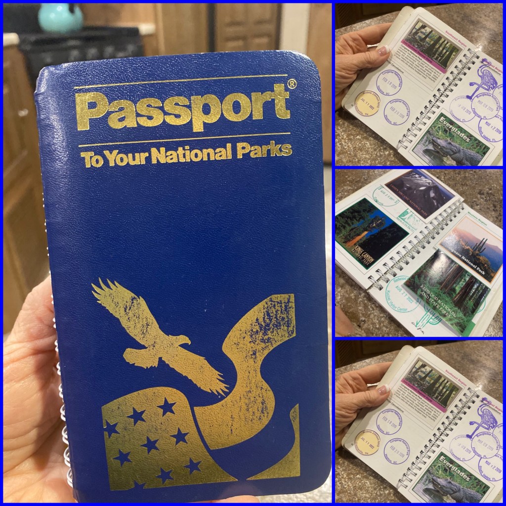 We received a question today about the National Park Passport we collect stamps and dates in, so I will show a picture of mine. They would make great presents for someone, who was just starting out on a journey of visiting them. Every park has a station with an ink pad and date stamp. They also sell the colorful stamps for about two dollars that you can add in the designated space.