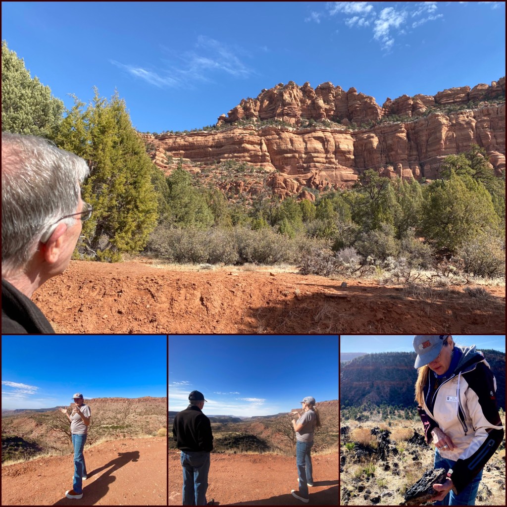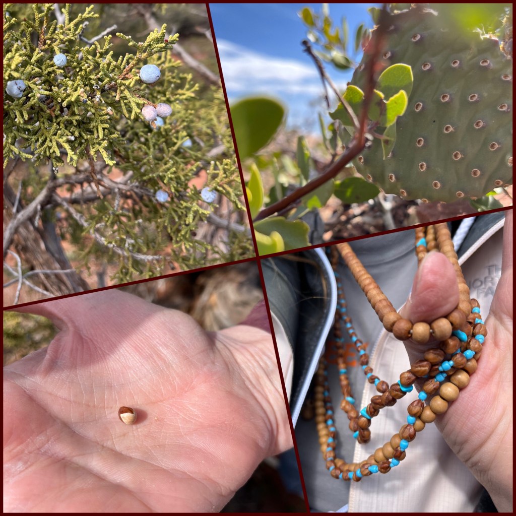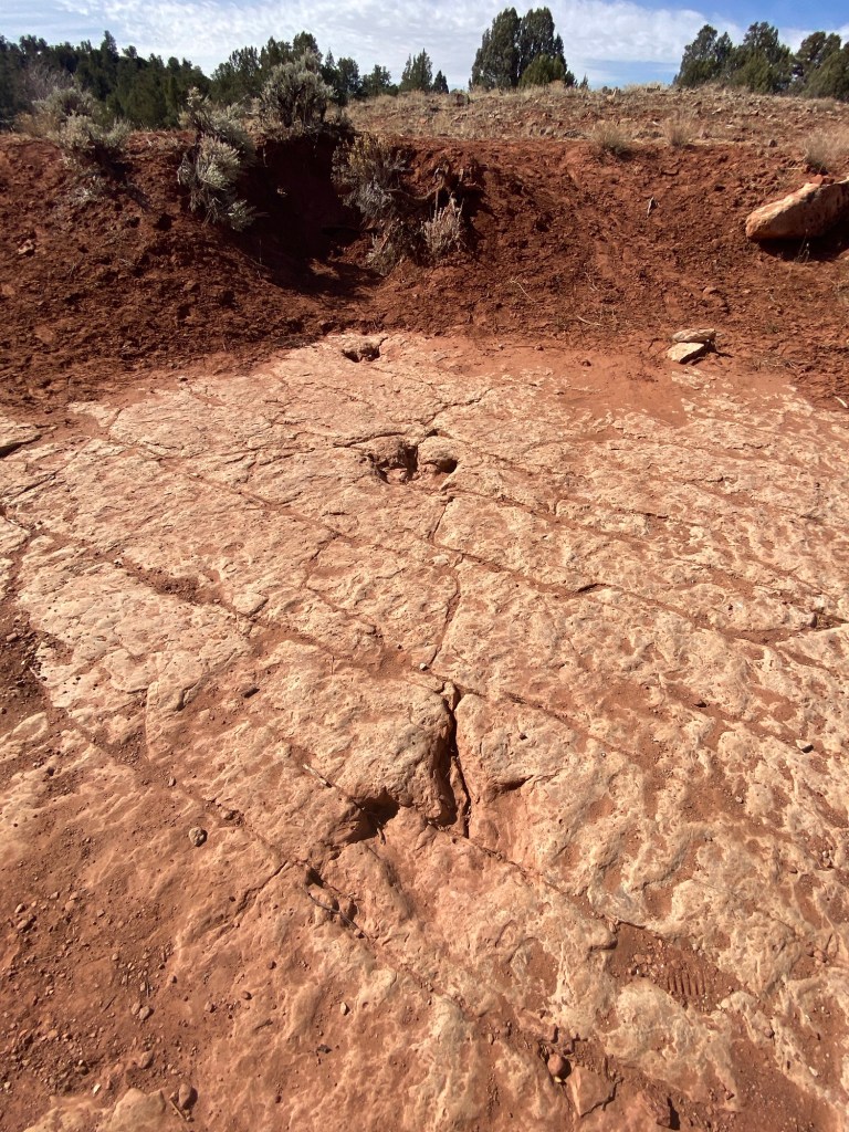 I was a slow poke but I got it done!These are two of the many plants she identified and shared. The Beaver-tail cactus on the upper right was used by the native inhabitants for food source- buds are steamed and eaten, Seeds are ground into mush, fruit is dried, thorns removed and then eaten. All of the other pictures are of the juniper shrub/ tree. Used as flavoring for meats and stews. Lastly, you can see Eva wore many necklaces made from the seeds of the juniper. Native Americans felt they would ward off evil spirits! These foot prints travel right across the solid rock trail where we were walking . They are thought to be the fossilized foot prints of a Dilophosaurus.