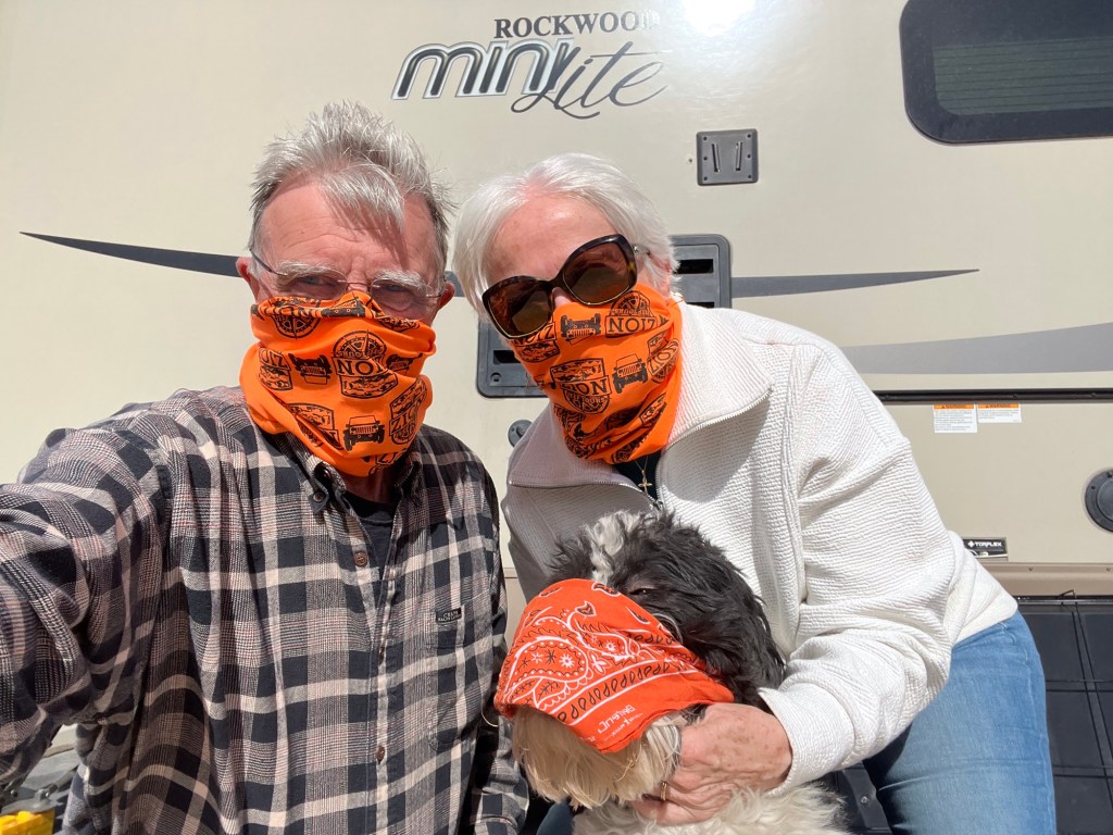 We arrived back to the camper in time for a wind and sand storm. 18 mph wind with gusts 30 and 40 mph. Our camper rattled and rolled for almost 3 hours. It was crazy! Even Finn didn’t like it! Eva had given Harry and I a neck gaiter to use if it got too dusty. We tried them out in the storm along with Finn.