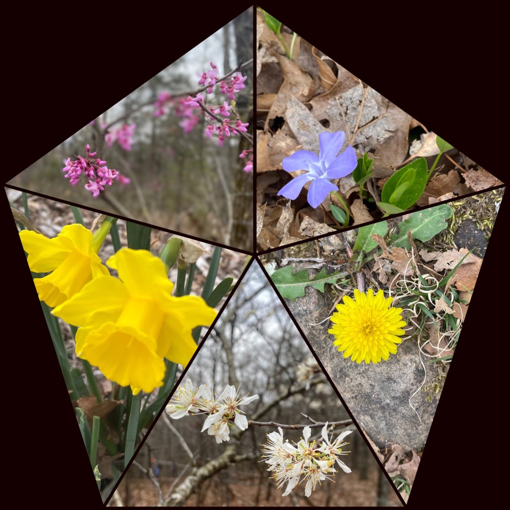 I think with these flowers clustered together it looks like a kaleidoscope. You can see by the picture above this one, that the Redbuds were in bloom. Starting at the very bottom of this picture you can see Service Berry, to the right of that, one lone Dandelion, above that Periwinkle, to the left of the Periwinkle, you can see the Redbud, and finally the Daffodil. We are missing our spring plantings at home this year. 🫤
