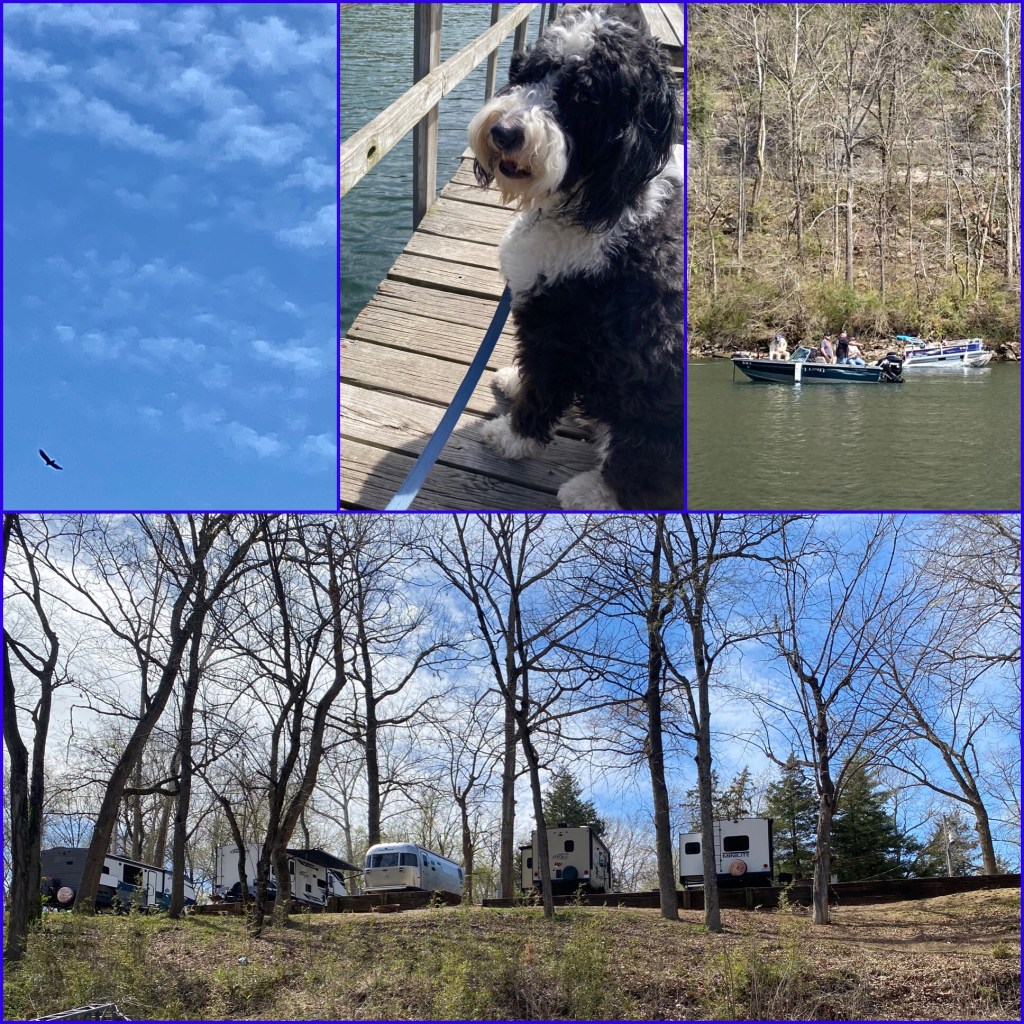 We spent a while this morning sitting on the dock watching all of the weekend fishing warriors float or in some cases speed by. The bottom picture is from the dock looking up at our camper (#2 from the right)