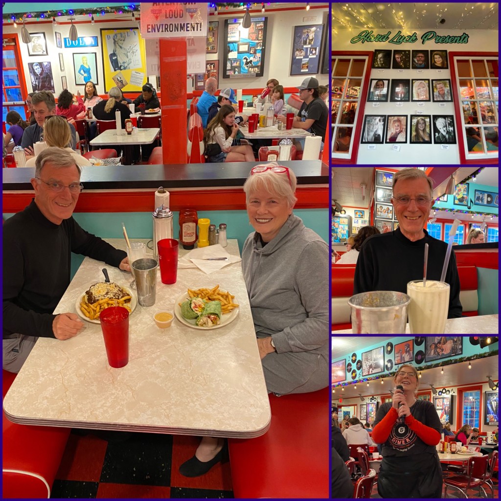 Mel’s Hard Luck Diner where the waiters and waitresses sing for your dinner! Kaitlyn, our waitress in the bottom right picture is singing at our table. It is a very loud restaurant…don’t go if you’d like an evening of quiet conversation. Food is fresh and delicious! And Harry remembered when you order a milk shake you get the metal mixing cup full, as well as your fancy milkshake glass.