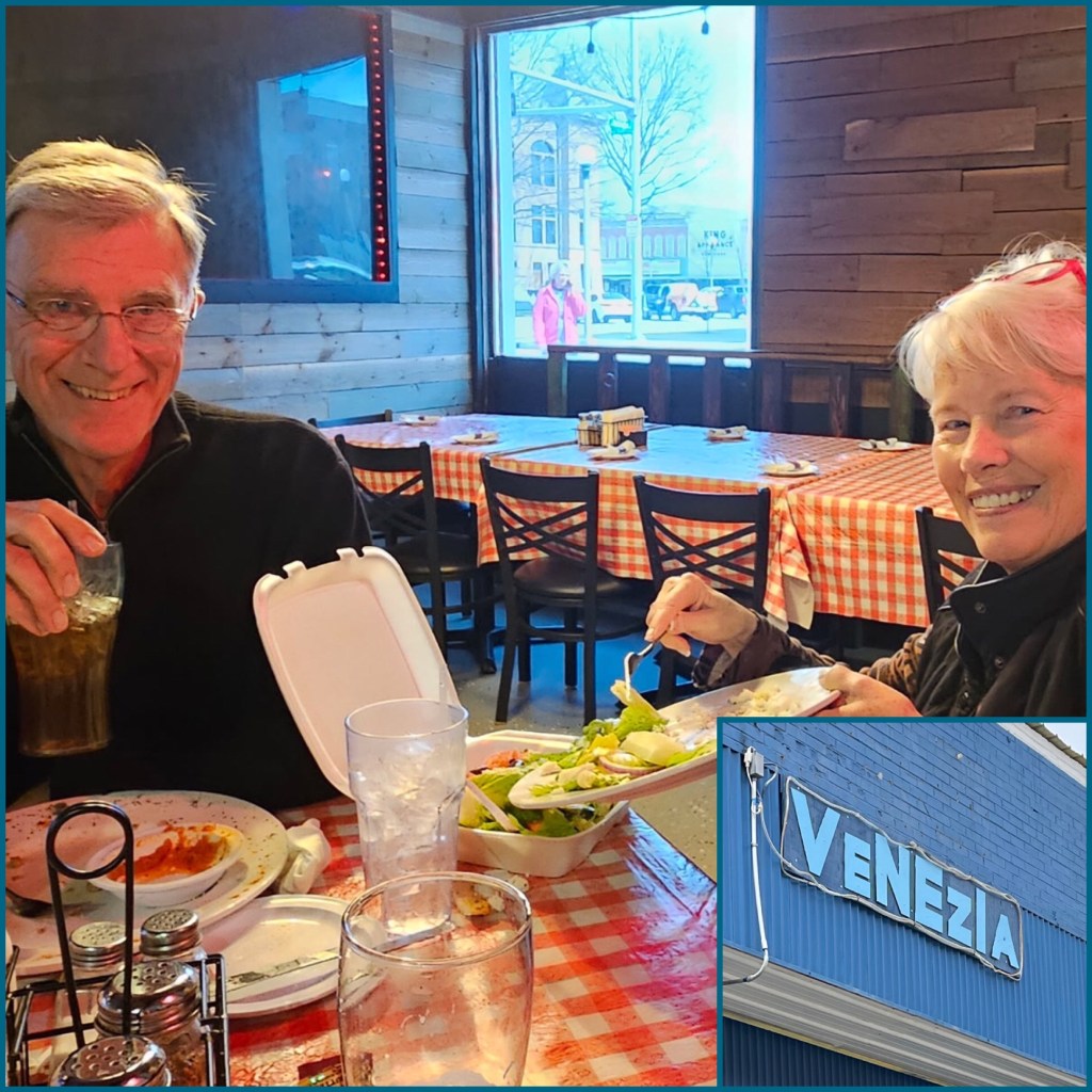 Venezia’s for lunch. Lest you think, only Harry and I ate…not so! We were all so busy eating I didn’t think of pictures until I was fixing my take home box and Dan grabbed his camera and shot this for us. It was a delicious Italian lunch!