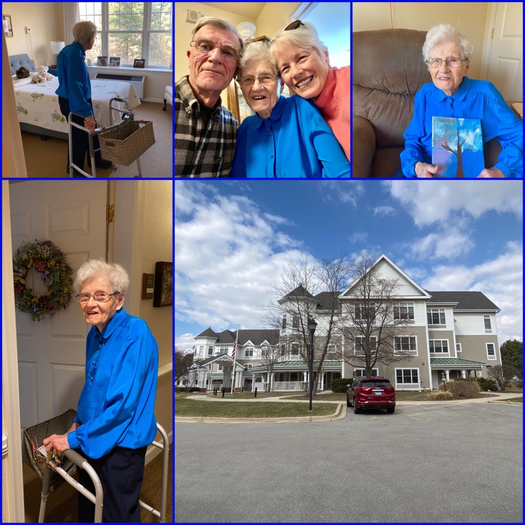 Sunrise Senior Living. Mom always has to show us her apartment…and the windows! #1 Top left- her bedroom. Can you see her cat, Dori curled up on her pillow? #2 Middle Top-Selfie time. #3 Top right-Mom and her spring tree painting. #4 Bottom left- Mom and her spring wreath from Jonesborough, TN #5 Sunrise Senior Living…