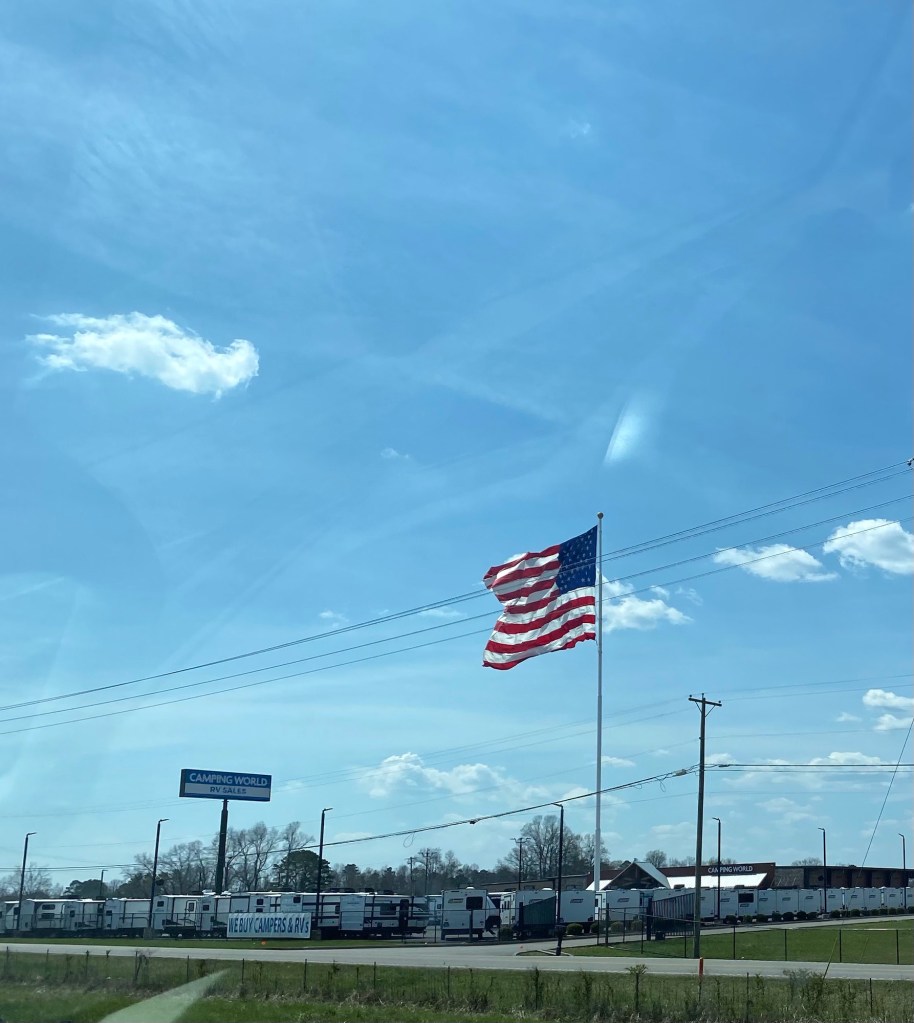The ride home was quite windy, as you can see by Camping World’s flag. 40’x 80’ flags take a lot of wind to have them take sail like this! Harry’s palms were sweating he was holding the wheel so tight getting us home!
